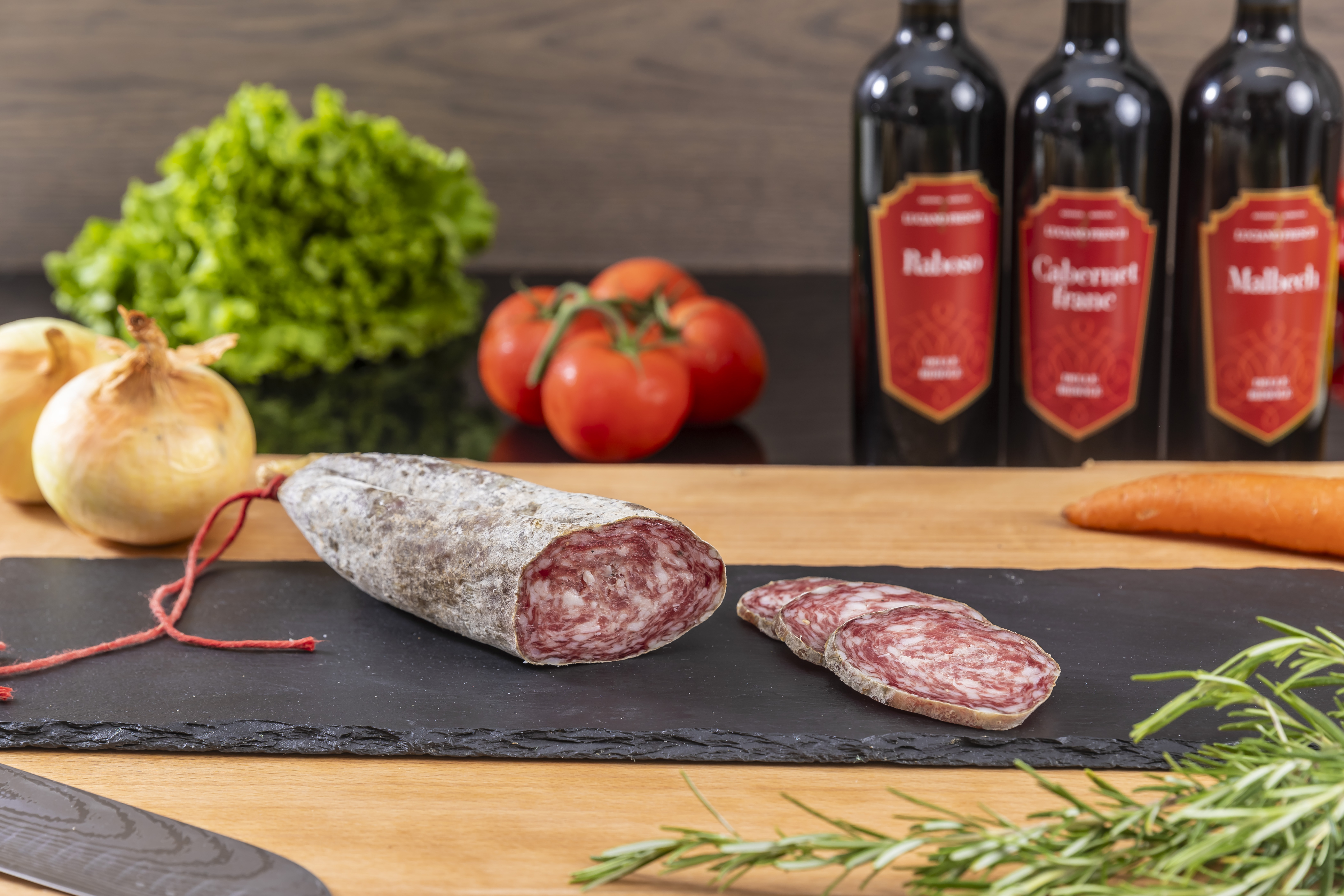 salame senza aglio di puro suino, sale, pepe, vino rosso, E 252